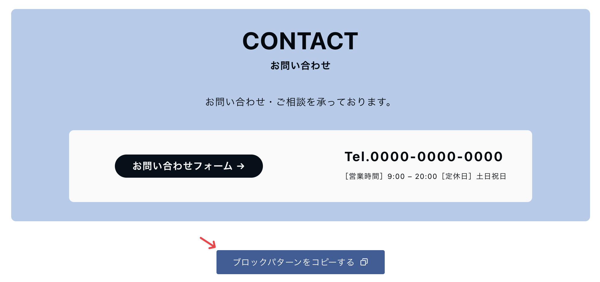 ブロックパターンの下部にあるボタン「ブロックパターンをコピーする」をクリックします。コピーが成功すると、「ブロックパターンをコピーしました!」とボタンのテキストが変化します。