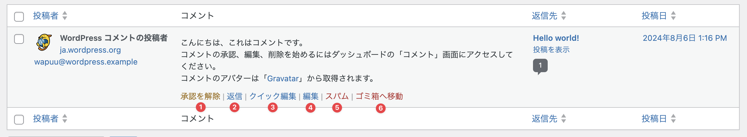 - スパム:クリックするとコメントはスパムに移動し、投稿されたコメントが投稿ページに表示されなくなります。