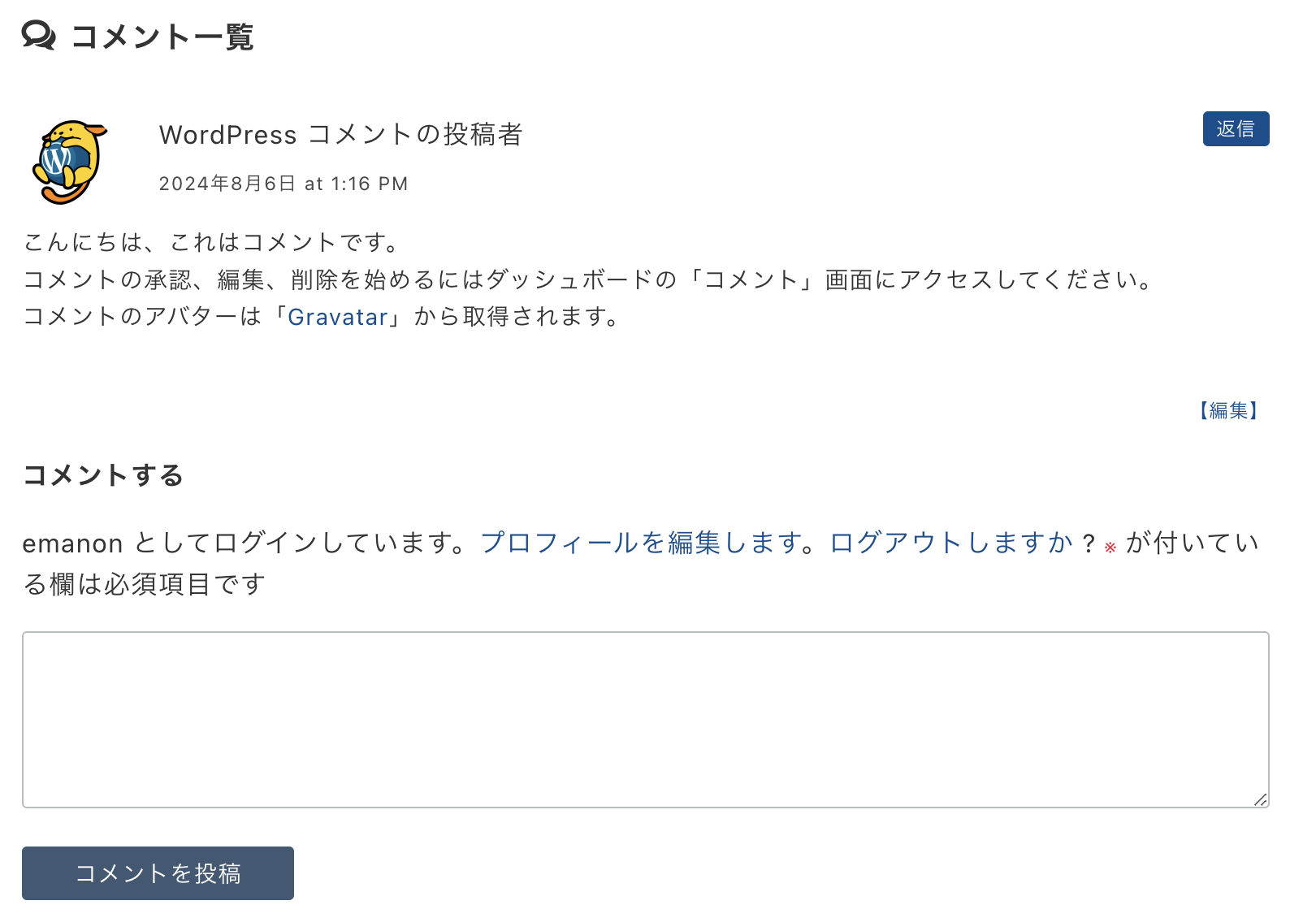 承認されたコメントは、コメントがついたページに表示されます。コメントの表示デザインは、WordPressテーマによって異なります。下記は、WordPressテーマ Emanonのコメント表示例です。