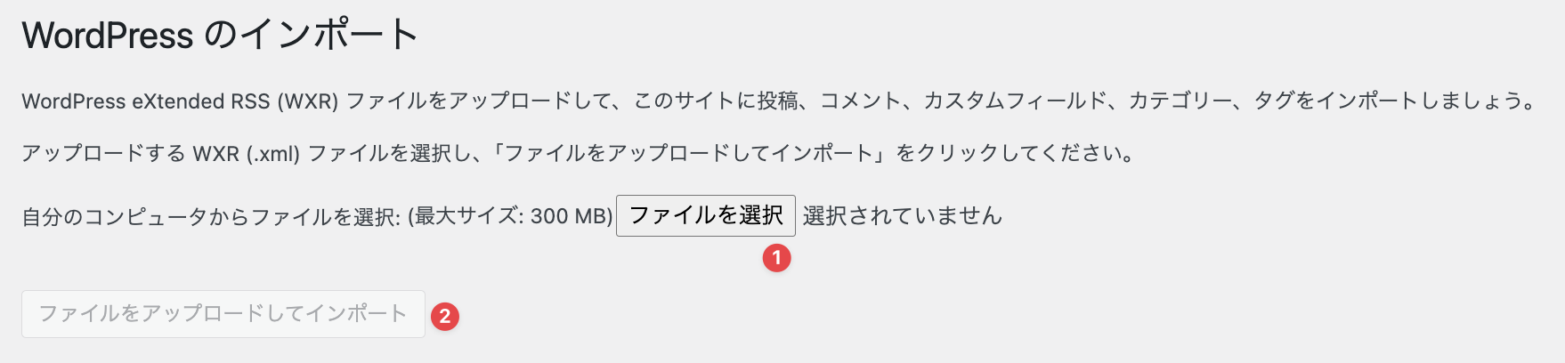 - ファイルを選択:クリックすると、自分のパソコンからWordPressにインポートするファイルを選択できます。