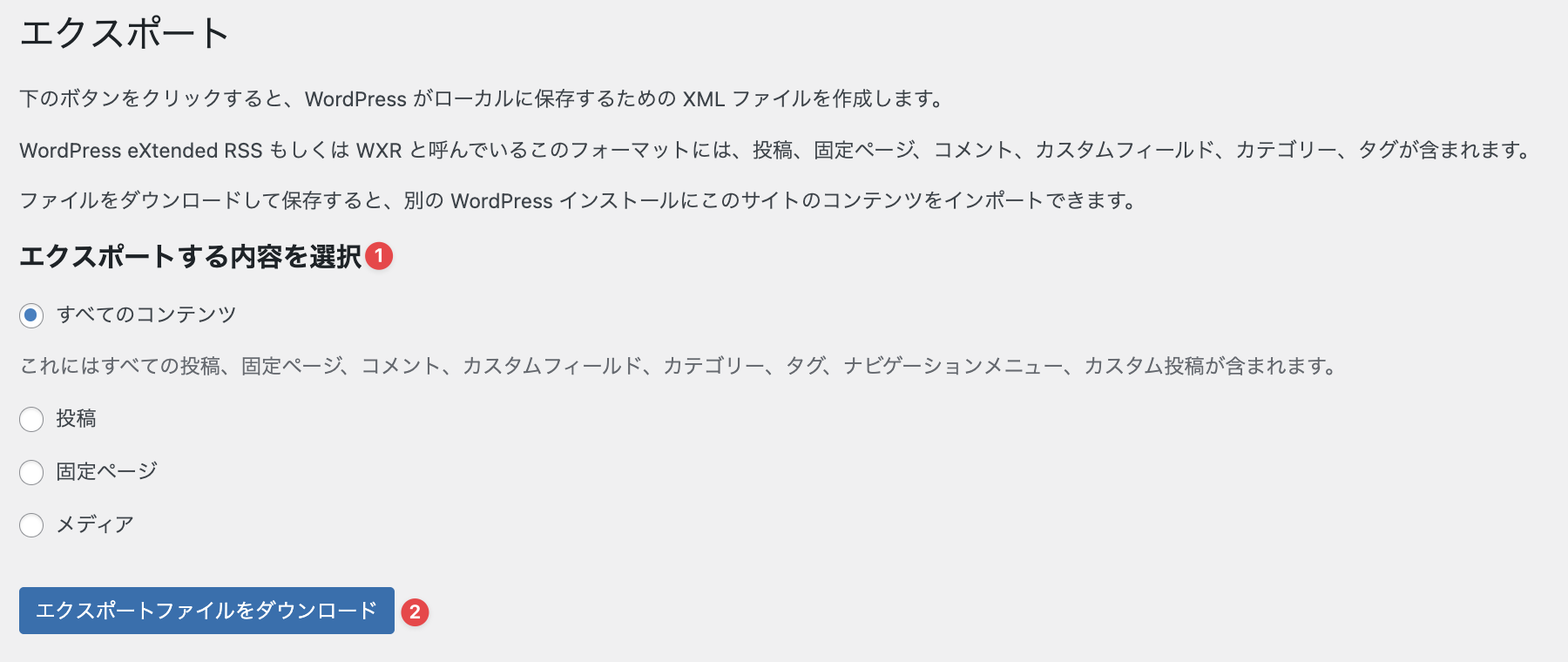 - エクスポートする内容を選択:すべてのコンテンツ、投稿、固定ページ、メディアからエクスポートする内容を選択します。選択できる内容は作成したコンテンツによって変わります。