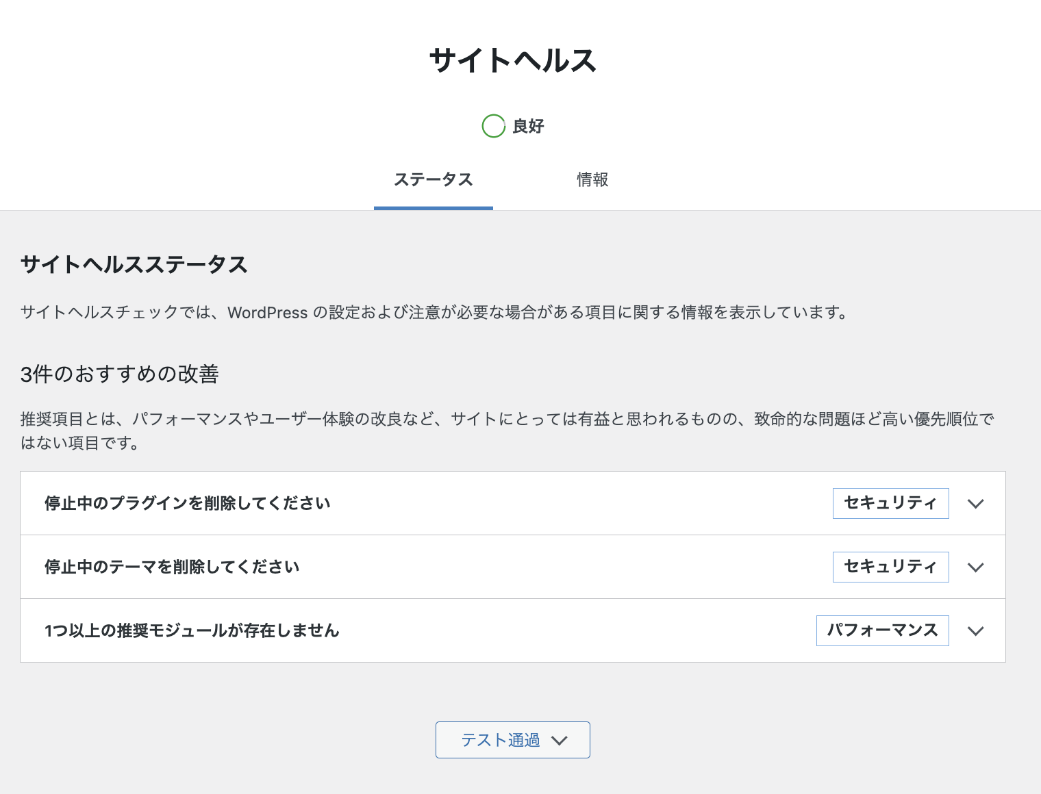 サイトヘルスでは、WordPressのセキュリティや表示に関する状態が確認できます。良好と表示されていれば、基本的に問題はありません。おすすめの改善は、可能であれば対策をした方が良いという内容です。