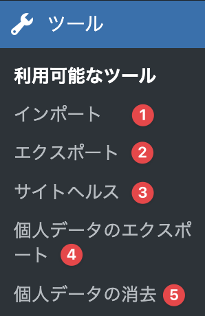 ツールとは、インポートやエクスポートによるWordPress間のデータ交換や、Webサイトの安全性をチェックしたり、テーマやプラグインの編集機能も備わっています。