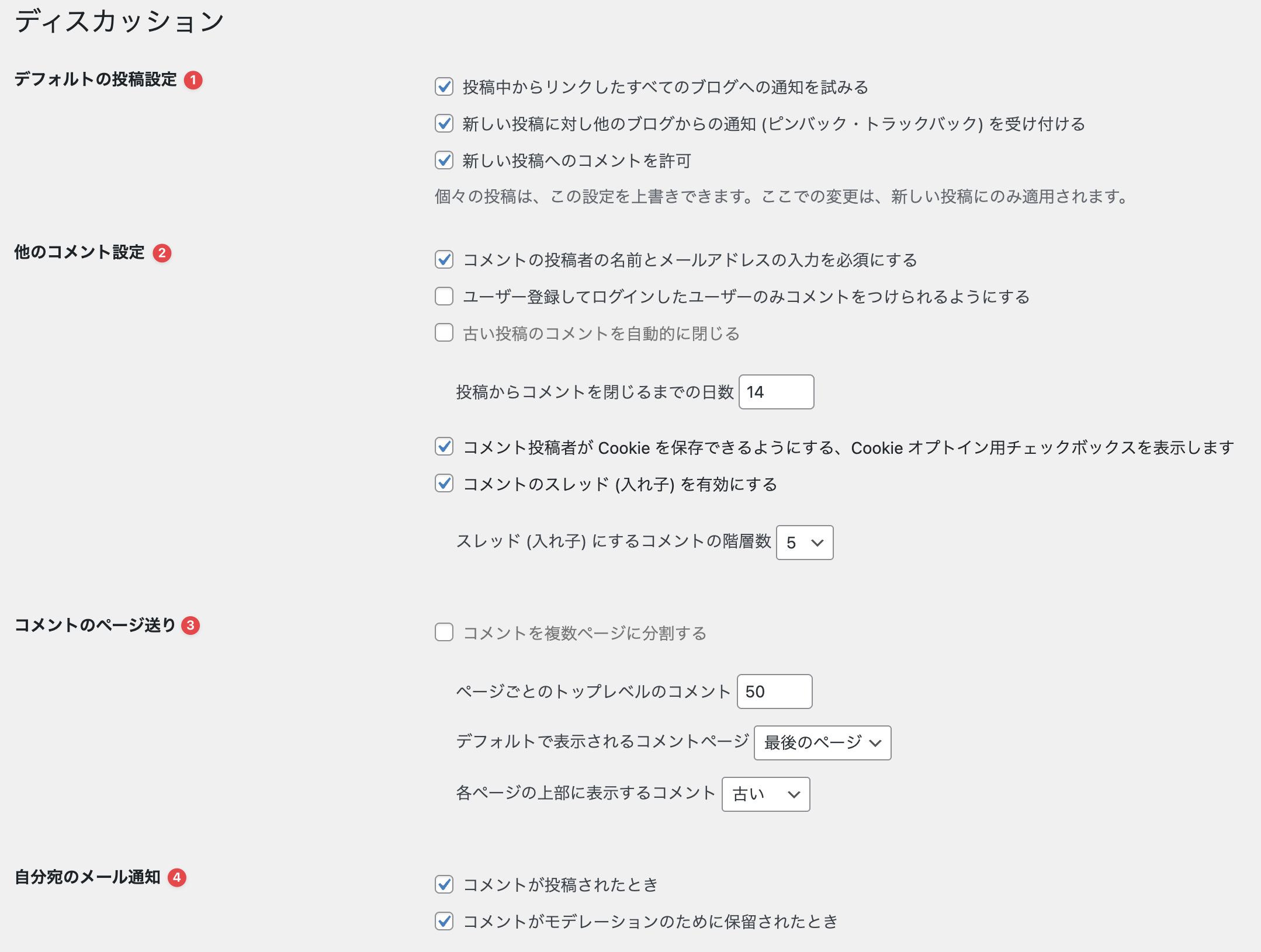 管理画面>設定>ディスカッションをクリックすると次の画面が表示されます。