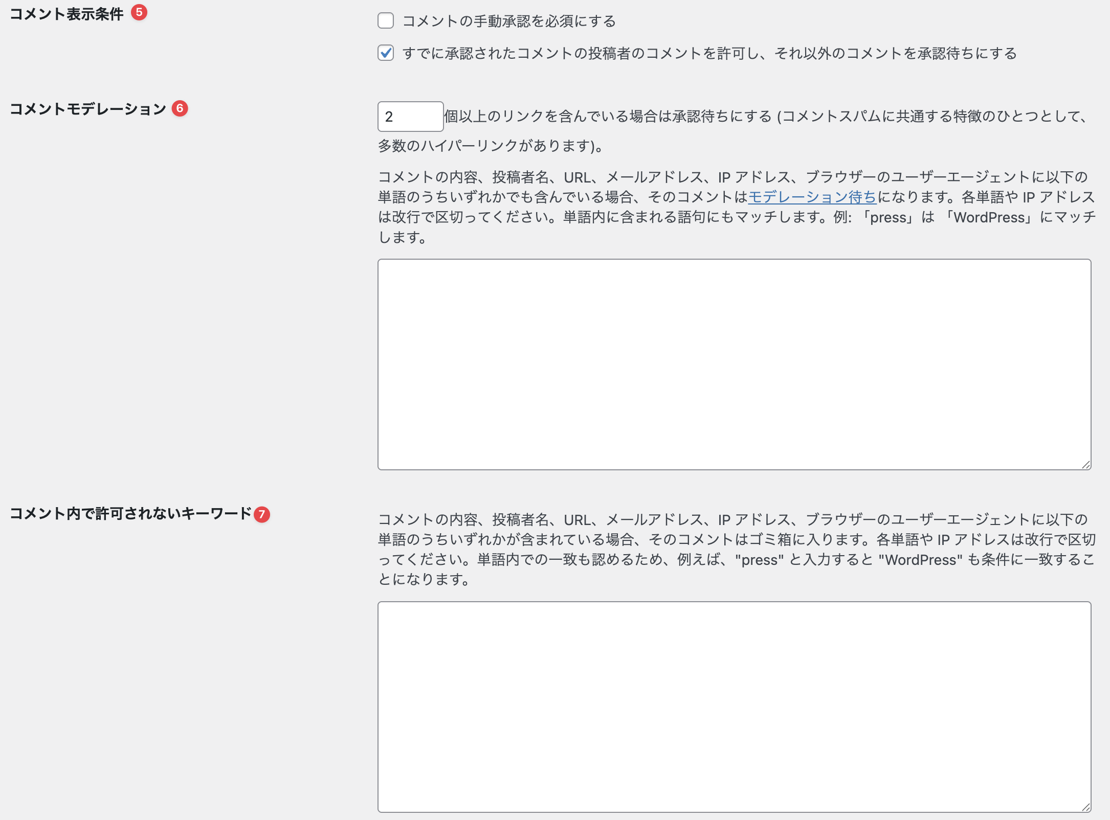 スパム対応で使用します。スパムコメントを投稿する投稿者名やメールアドレス、IPアドレスを入力して「変更を保存」をクリックするとマッチしたコメントは自動でモデレーション待ち(管理者の承認が必要)になります。